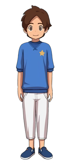Er hat kurze braune Haare, trägt einen blauen Pullover mit einem gelben Stern auf der oberen Seite, eine weiße Hose und blaue Schuhe. Er sieht seinem Vater ähnlich.